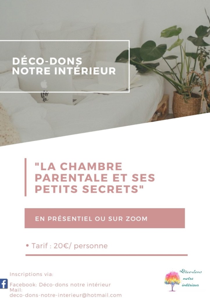 Samedi 07/11/2020: Atelier à thème « La chambre parentale et ses petits secrets ». Cet atelier se déroulera sur Zoom.