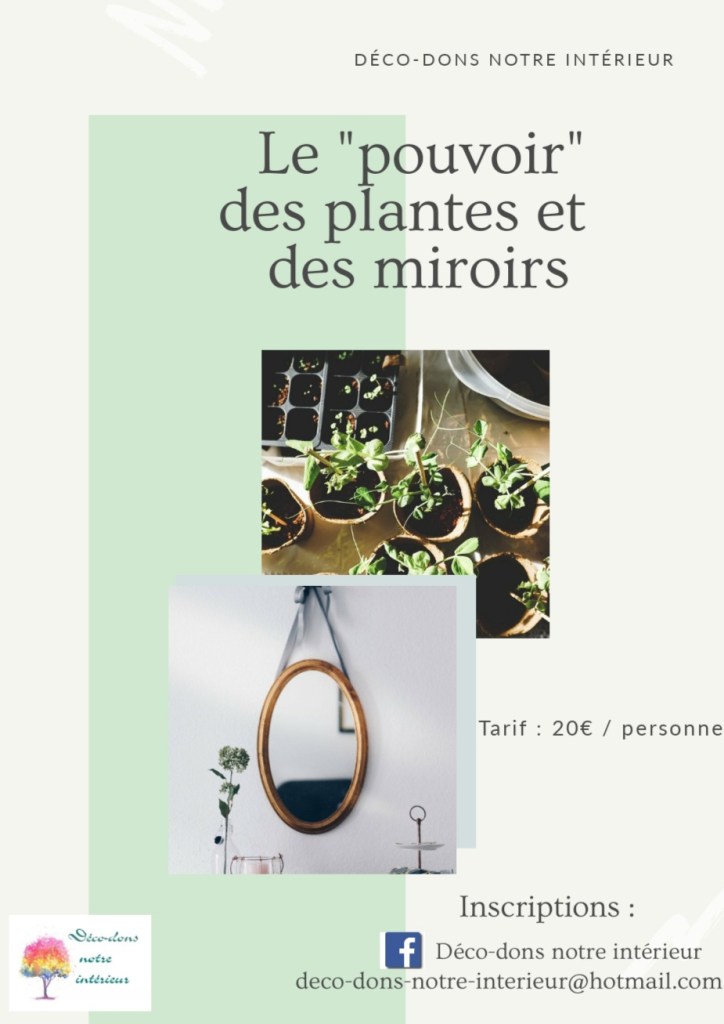 23/09/2020 18h: Atelier à thème « Le pouvoir des plantes et des mirroirs en Feng-Shui occidental ». Cet atelier se déroulera chez Déco-dons notre intérieur à Estaimpuis.